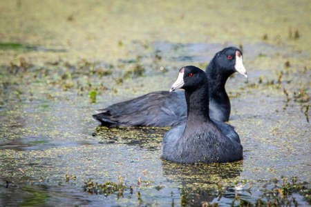Two American Coots Swimming Across the Still Water