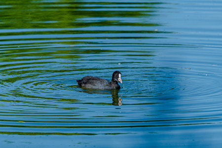 A common coot - Fulica atra - swim in the water on a sunny day in springtime. Saint Petersburg, Russia.
