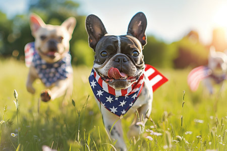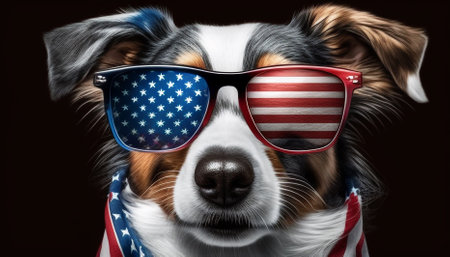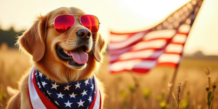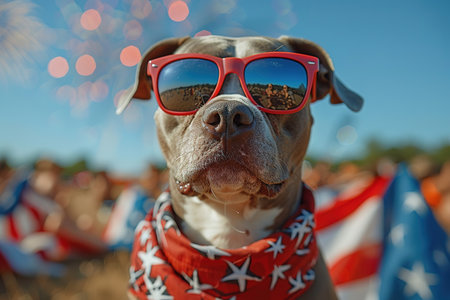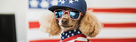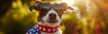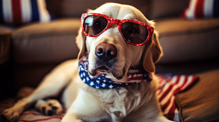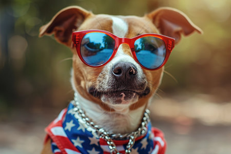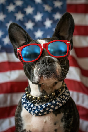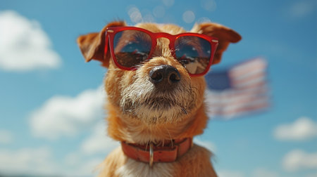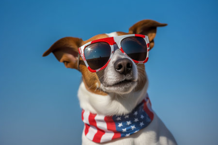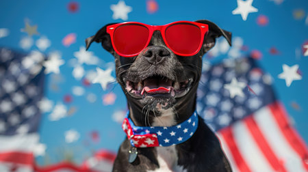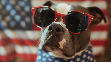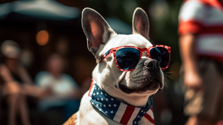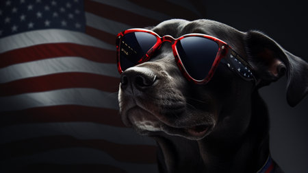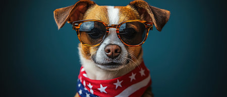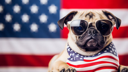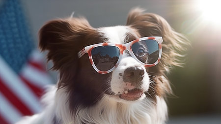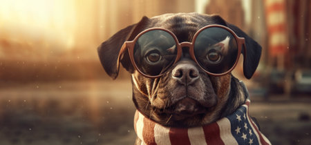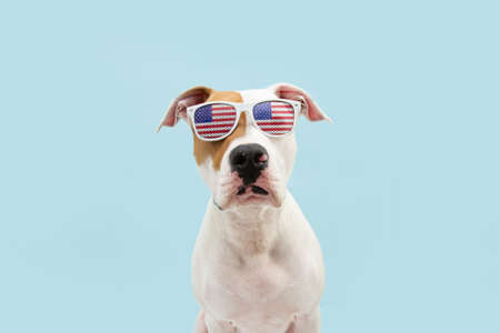 Funny independence day 4th of july dog wearing american flag glasses costume.