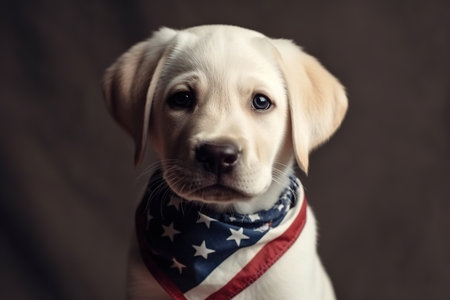 Patriotic white Labrador dog dressed in red white and blue top hat and bandana while celebrating 4th July holiday on city street.