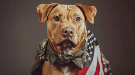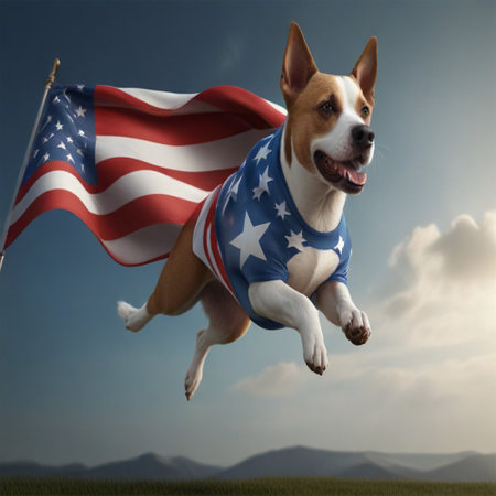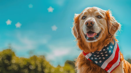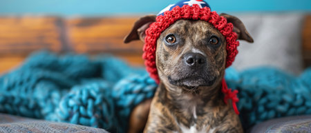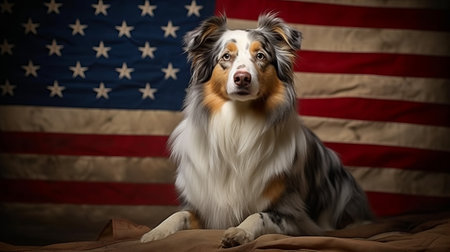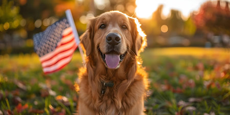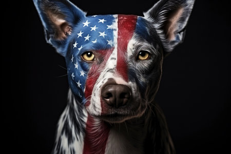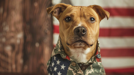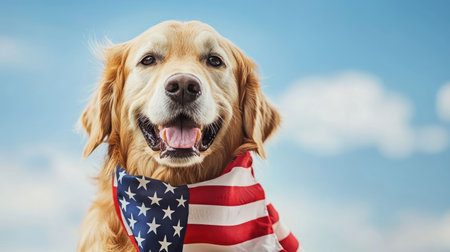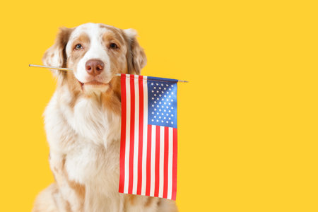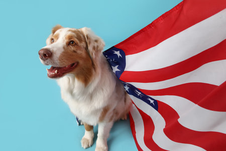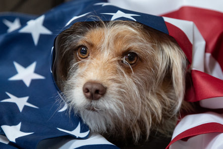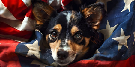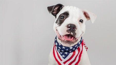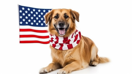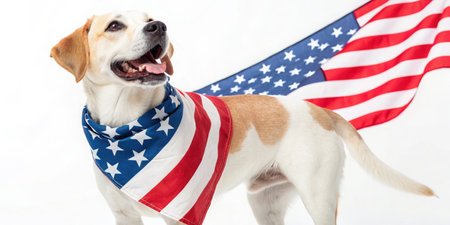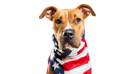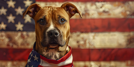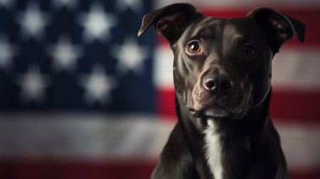 US Elections. 2024 Presidential Election. Adorable dog and American Flag. Close-up, indoors. Studio shot. Pet care concept. Beautiful Election day invitation card, isolated background