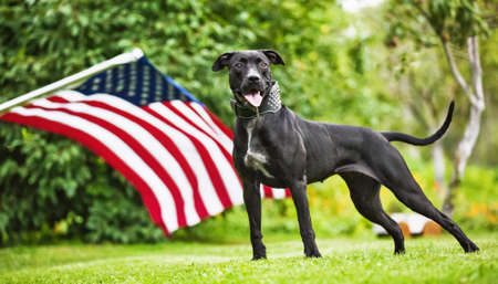 Cute black dog on the background of the American flag. Portrait of a dog.