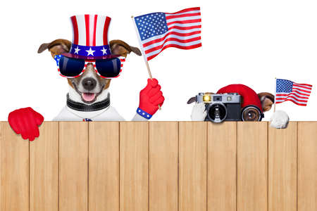 Happy Independence Day. American Flag, cute dog and congratulatory inscription. Closeup, indoors. Studio shot. Congratulations for family, loved ones, friends and colleagues. Pets care concept