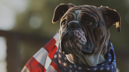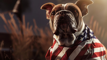 Dog lies on grass wrapped in american flag. Celebration of Independence day, 4th July, Memorial Day, American Flag Day, Labor day party event