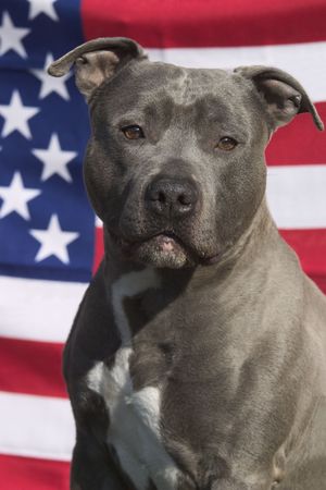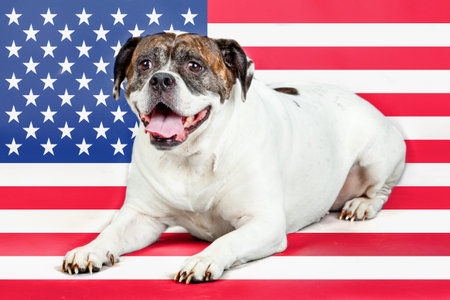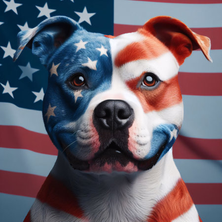 Independence day 4th of July American Staffordshire dog. Isolated on blue colored background