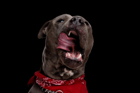 funny amstaff dog wearing red bandana and silver collar sticking out tongue and licking mouth on black background