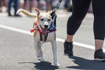 Forth of July holiday parade in small town is perfect place to walk the Jack Russel dog with stars and stipes bandana.