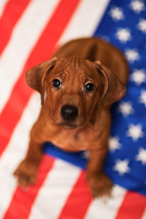 cute rhodesian ridgeback puppy posing in front of american usa flag on Independence Day
