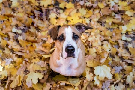 Cute dog sits in a heap of yellow maple leaves. Young staffordshire terrier in beautiful autumn leaves in a park looking up