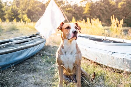 A dog sits in front of canoe boats in beautiful evening light. Active rest with domestic pets concept: american staffordshire terrier at a kayaking river trip