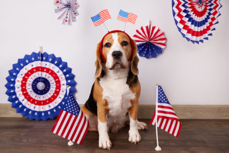 Beagle dog with American flag headband. Happy Memorial Day. Independence Day card with pet. The room is decorated for the holiday.