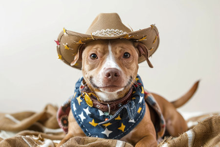 Cute dog in cowboy hat with scarf against USA flag, closeup. Independence Day celebration