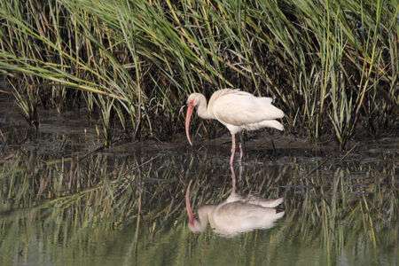 An American White Ibis and its reflection wades in a coastal marsh near sunset