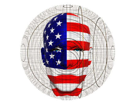 A man's profile is shown in a digital art image. The American flag is superimposed over the man's head and torso, with the stripes and stars appearing as a textured, somewhat abstract pattern. The background is a simple off-white.