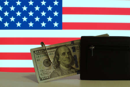 100 US dollars banknote and wallet on blurred american flag background