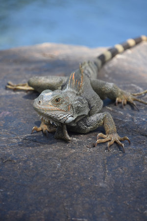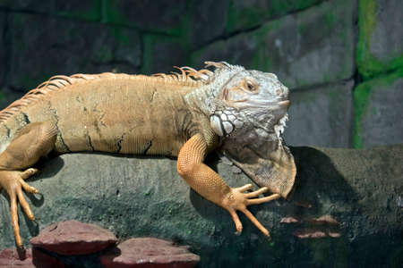 Close up shot of large iguana lying on rock. Big lizard species in tropical safari park