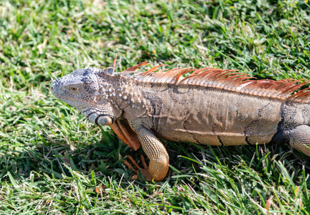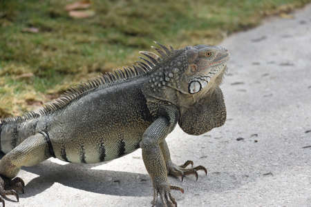 Close up of green iguana, Latin name Iguana iguana, in the south Florida. Iguanas are not native to Florida.