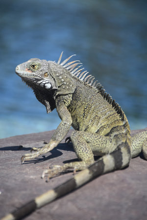 Common grey iguana sunning on a rock and gazing at water in Aruba.
