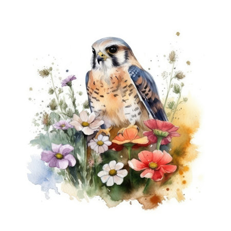 Enchanting Baby Kestrel in a Colorful Flower Field for Art Prints and Greeting Cards. Generative AI