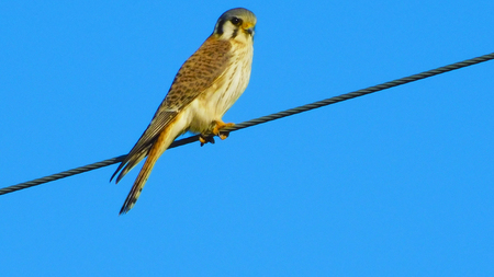 Beautiful American kestrel (Falco sparverius) perchedon an electric line with a blue sky in the background