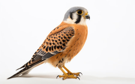 This image features a kestrel in mid-flight, isolated against a white background. The bird's wings are spread wide, showcasing its detailed plumage and sharp talons. The kestrel's focus and agility are evident as it soars through the air. The white background emphasizes the bird's natural colors and intricate patterns, making it the focal point of the image.