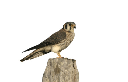 Kestrel falcon closeup head and chest portrait on white background beak slightly open and sharp eye catchlight for raptor wildlife themes