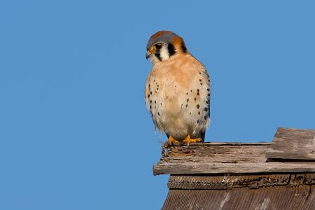 Adult male American Kestrel, or sparrow hawk, perched on small roof.