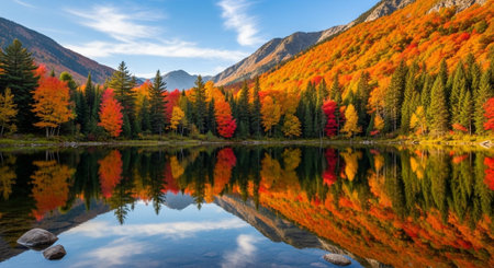 A serene autumn lake surrounded by vibrant foliage, captured during the golden hour. The image exudes peace and tranquility, perfect for nature and landscape photography. Ideal for use in commercial projects needing a calming natural backdrop.