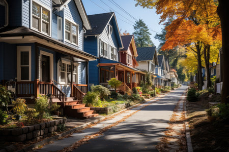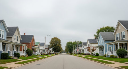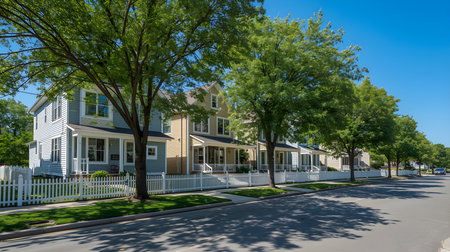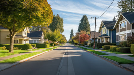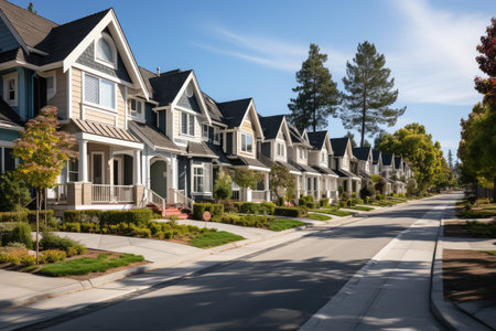 quiet residential street, with houses lined up in perfect symmetry, created with generative ai