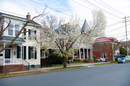 street in the historic town of Martinsburg, West Virginia. Ancient architecture of small multi-colored buildings in the colonial style.