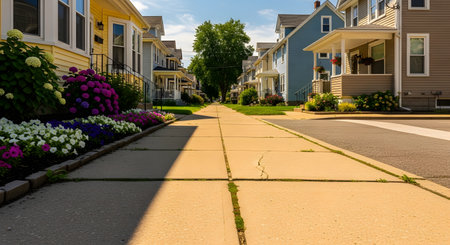 Quiet suburban street in warm sunlight, empty sidewalks lined with trees and cozy houses, a peaceful, undisturbed atmosphere.