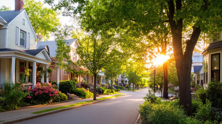 A tranquil suburban street bathed in golden sunlight showcases beautiful homes and lush greenery. Perfect for themes of community, nature, and relaxation.