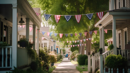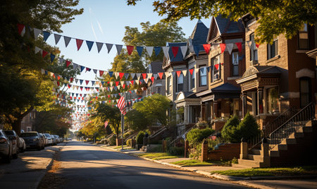 Patriotic decorations on a suburban street for Labor Day, festive atmosphere,