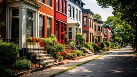 neighborhood street with diverse architecture, created with generative ai