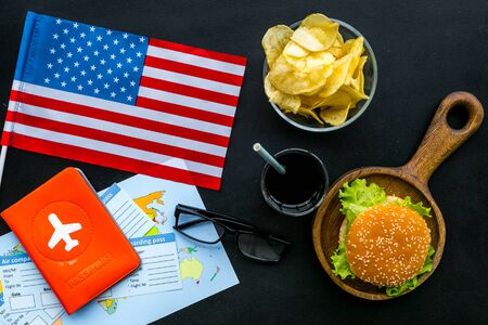 Gastronomical tourism concept with american flag, passport, tickets, map, glasses and food symbols, burgers, chips, coke on black background top view