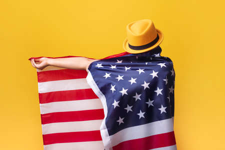 gir with American flag over yellow background, girl in fashionable hat with USA flag