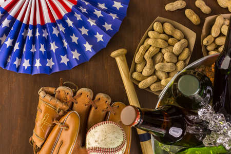 Close up of old worn baseball equipment on a wooden background.