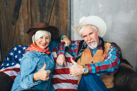 Elderly couple dressed in cowboy hats, showing thumbs up, smiling and looking at camera
