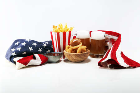 fries, beer and onion rings for football on a table. Great for Bowl football Game