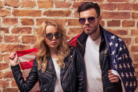Cool beautiful young couple in leather jackets and sunglasses is looking at camera, standing covered with American flag against brick wall