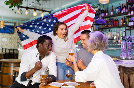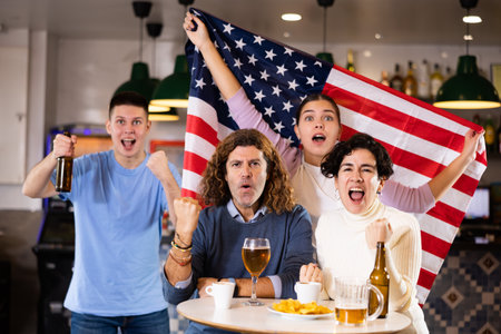 Emotional group of young adult sports fans supporting American team with state flag while resting in bar with beer