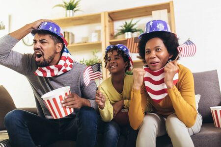 Happy African American family of three watching tv and cheering sport games on sofa at home