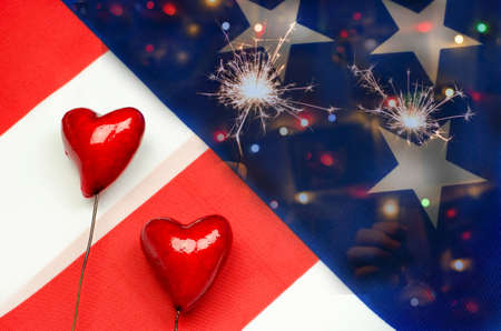 Two red hearts on the background of the American flag. Congratulations on Independence Day. National American Holiday Independence Day