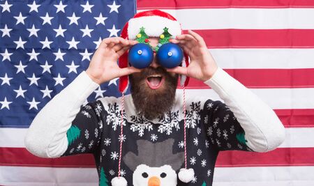 Great american Christmas. Happy santa american flag background. Big eyes. Excited look. Happy to see. Bearded american man. Celebrate Christmas and new year american way. Winter greetings. Having fun