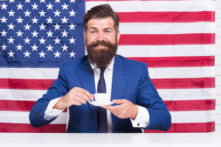 Businessman with American flag and coffee. politician drink coffee. Bearded businessman patriotic for usa. happy national holiday. USA celebrate 4th of July. English language learning