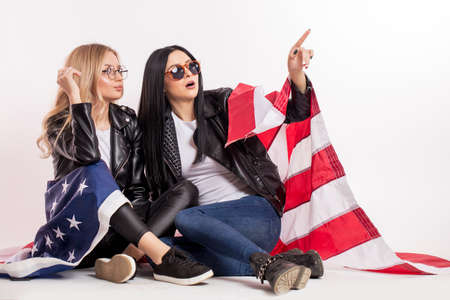 two beautiful young women holding national usa flag in background, sucking a lollipop, outdoors