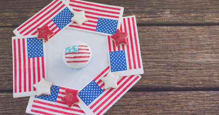 Close up view of american flag design cookies on wooden surface with copy space. american independence and patriotism concept