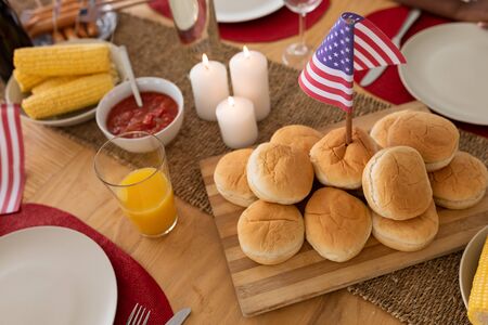 Close-up of American flag kept on a bun at dining table