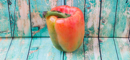 Fresh red bell pepper close up on geometric colorful background. Organic vegetable suitable for vegans and vegeterians. Healthy food ingredient concept