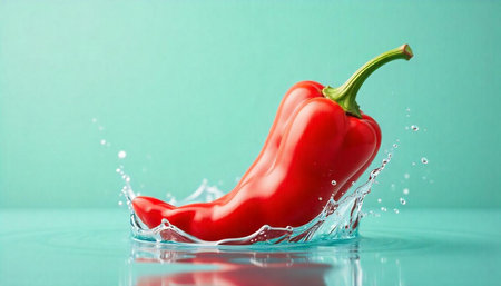 Vibrant red bell pepper splashing into crystal clear water